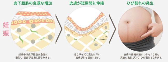 妊娠線は短期間で急激に皮膚が伸縮することでできた皮膚の中でも奥の深い部分『真皮のダメージ』によるもの。