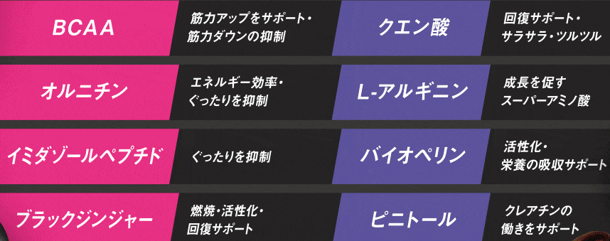 さらに筋力がついても女性らしいスタイルで痩せられるサポート成分も豊富。